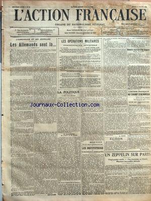 L'ESPIONNAGE ET LES ZEPPELINS - LES ALLEMANDS SONT LA... PAR LEON DAUDET - LES OPERATIONS MILITAIRES - COMMUNIQUES OFFICIELS - 30 JANVIER TROIS HEURES SOIR - ONZE HEURES SOIR - COMMUNIQUE BELGE - COMMUNIQUE BRITANNIQUE - LA POLITIQUE - I. QUI NOUS GENONS - II. ANARCHISTES DE CENTRE ET DE DROITE - III. AVEC L'APPUI DE LA FRANCE... PAR CHARLES MAURRAS - LES INSTITUTEURS ET LA MANOEUVRE COSMOPOLITE PAR L. DIMIER - ECHOS - NOUVELLE INCURSION D'UN ZEPPELIN SUR PARIS - L'ACTION FRANCAISE - AU CHAMP D'HONNEUR - QUATRE CENT CINQUANTE-SEPTIEME LISTE PAR J. CHALLAMEL - UN ZEPPELIN SUR PARIS - VINGT-QUATRE MORTS - UNE TRENTAINE DE BLESSES - PLUSIEURS IMMEUBLES DETRUITS - NOS AVIONS FONT LA CHASSE. .