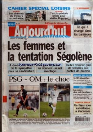 CAHIER SPECIAL LOISIRS - BALADES LES CHARMES DU VERCORS EN AUTOMNE - TOURISME C'EST LA PERIODE IDEALE POUR VISITER FLORENCE - 11 SEPTEMBRE CE QUI A CHANGE DANS LES BANLIEUES - LES FEMMES ET LA TENTATION SEGOLENE - A DROITE ELLES ONT DE LA SYMPATHIE POUR SA CANDIDATURE - A GAUCHE ELLES LUI DONNENT UN NET AVANTAGE - TOUTES VEULENT PLUS DE FEMMES AUX POSTES DE POUVOIR - AFFAIRE DES TAXIS - 9 CRS IDENTIFIES - HUITRES - LA COLERE DES OSTREICULTEURS - QUINTE DE DEMAIN UN BIJOU SOUS SURVEILLANCE - PSG OM LE CHOC - FOOTBALL .